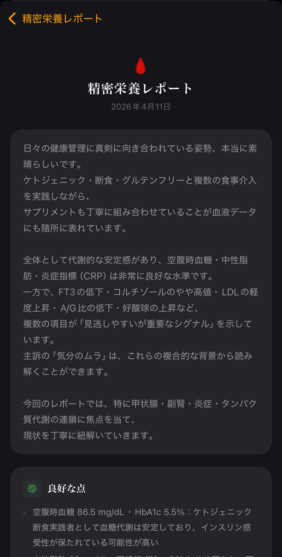 全項目が揃っていなくても解析できます。精度は測定された項目の数に応じて上がります——「まずは手持ちのデータで始めて、次回の検査で項目を足していく」という使い方が現実的です。最低限(この7項目でも実用的なレポートになる)HbA1c / 空腹時血糖 / LDL / HDL / 中性脂肪 / AST / ALT糖代謝・脂質代謝・肝機能という、ケトジェニック評価の骨格をカバーします。あると解析の深さが一段上がる総コレステロール、γ-GTP、BUN、クレアチニン、eGFR、フェリチン、25-OHビタミンD、TSH、亜鉛、CRP鉄・炎症・甲状腺・ミネラルの観点が加わり、「なぜ数値が動かないか」の背景まで読み解けるようになります。理想は精密栄養学フルパネル上記に加えて、血球計数(WBC/RBC/Hb/Ht/血小板)、白血球分画、蛋白分画(TP/A.G/アルブミン)、LDH、ALP、ChE、CK、アミラーゼ、尿酸、1,5-AG、電解質(Na/K/Cl/Mg/Ca)、鉄・TIBC、銅、ビリルビン各種、FT3/FT4、コルチゾール、空腹時インスリン、H.ピロリ抗体全身の代謝を多層的に読み解けるようになります。人間ドックのフルパネルを撮れば、ほぼすべて含まれています。単位についてmg/dL と mmol/L のどちらの表記でもそのままアップロードできます。マレーシア・欧州系ラボの mmol/L 表記はアプリが自動的に変換して判定します。 You don't need every marker — the analysis works with whatever your panel contains, and accuracy scales with the number of items present. Starting with your current labs and adding more on the next test is a perfectly reasonable approach.Bare minimum — useful with just these sevenHbA1c · Fasting glucose · LDL · HDL · Triglycerides · AST · ALTCovers glucose metabolism, lipid profile, and liver function — the backbone of any ketogenic evaluation.Adds meaningful depthTotal cholesterol, γ-GTP, BUN, creatinine, eGFR, ferritin, 25-OH vitamin D, TSH, zinc, CRPIron status, inflammation, thyroid, and minerals. Helps explain why numbers aren't moving.Full precision-nutrition panel (ideal)Add CBC (WBC/RBC/Hb/Ht/platelets), WBC differential, protein fractions (TP/A.G/albumin), LDH, ALP, ChE, CK, amylase, uric acid, 1,5-AG, electrolytes (Na/K/Cl/Mg/Ca), iron/TIBC, copper, bilirubin, FT3/FT4, cortisol, fasting insulin, H. pylori antibodyReveals whole-body metabolic patterns across multiple systems. A standard comprehensive physical-exam panel usually covers most of these.UnitsBoth mg/dL and mmol/L are supported. The app automatically converts mmol/L results (common in Malaysian and European labs) before evaluation.