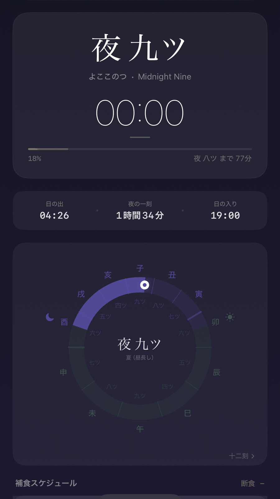 日の出から日の入りまでを六等分、日の入りから日の出までを六等分。端末の位置情報から、あなたの今日の十二刻がリアルタイムに計算される。季節で一刻の長さは伸び縮みする——それこそが、江戸の時間だった。 Six divisions from sunrise to sunset. Six more from sunset to sunrise. Your twelve koku are calculated in real time from your device's location. Each koku stretches and contracts with the season — that was Edo's time.