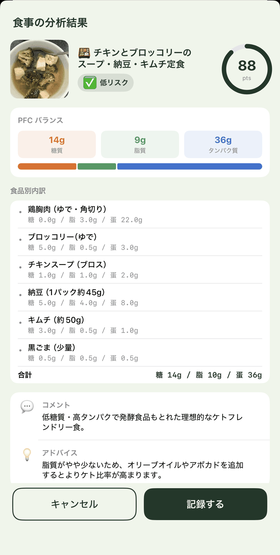 撮るだけで、糖質・脂質・タンパク質をAIが推定。ケト適合度が日次スコアに反映される。1食に5枚までアップ可能。 Snap a meal. AI estimates carbohydrates, fats, and proteins. Keto fit flows directly into your daily score. Up to five angles per meal.