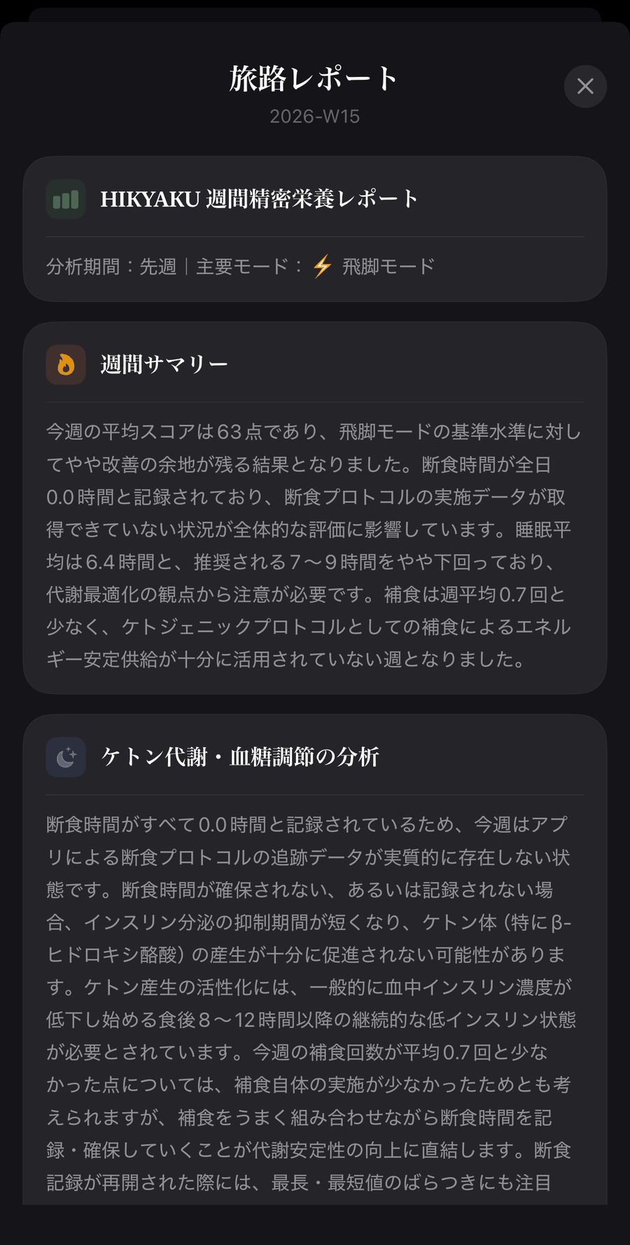 毎日の記録を、精密栄養学の視点で読み直す。AIは評価を下すためにあるのではない——あなたのデータが、あなた自身の言葉に戻されるために働く。 Your daily records, re-read through the lens of precision nutrition. The AI isn't here to grade you — it works so your data speaks back to you in your own voice.